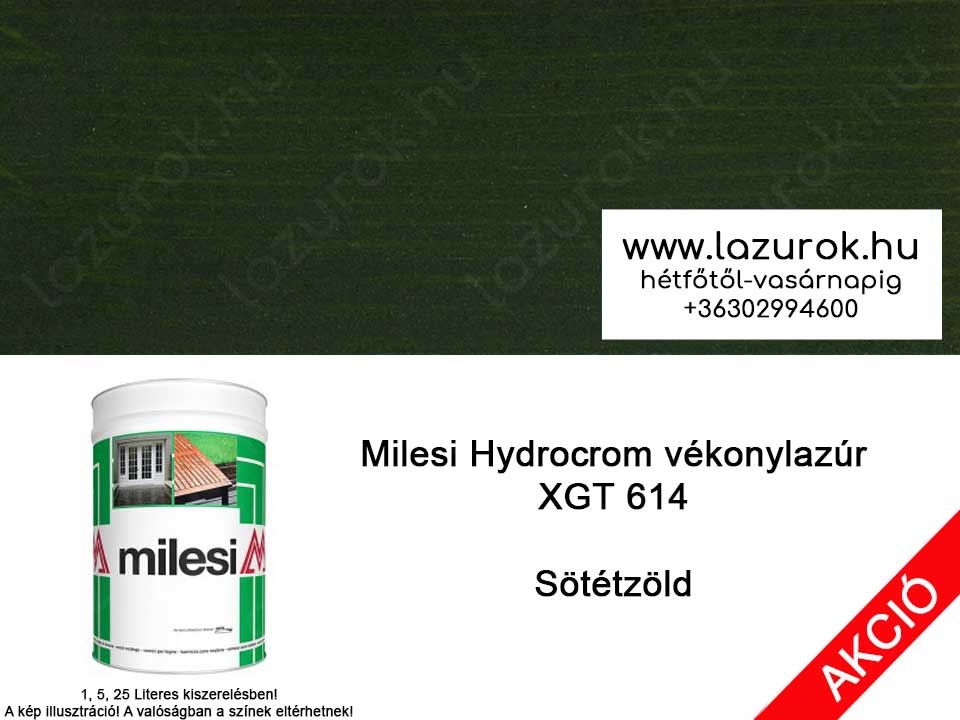Milesi vékonylazúr, xgt 614, sötétzöld, Hydrocrom, xgt vékonylazúr, viaszos vékonylazúr, vizes bázisú lazúr, fafelület kezelés, Milesi Hydrocrom XGT 614 sötétzöld színű viaszos vékonylazúr 25l termék.