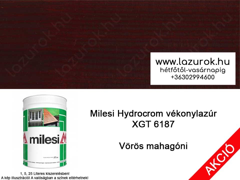 Milesi vékonylazúr, xgt 6187, vörös cseresznye, Hydrocrom, xgt vékonylazúr, viaszos vékonylazúr, vizes bázisú lazúr, fafelület kezelés, Milesi Hydrocrom XGT 6187 vörös mahagóni színű viaszos vékonylazúr 1l termék.